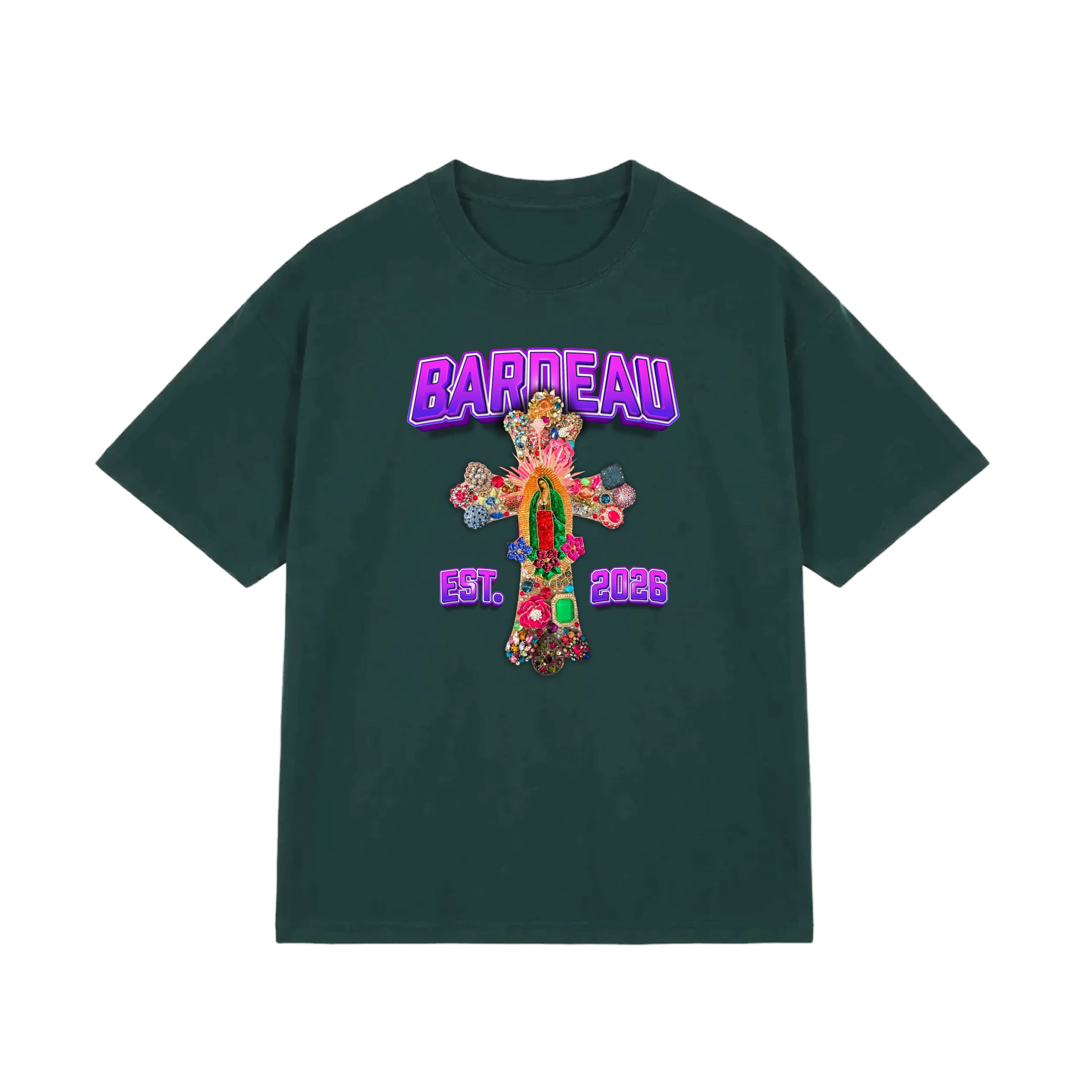 Het Bardeau Bohemian Cross T-shirt in deep green is jouw statement piece: een rijke boho-cross print, paarse Bardeau-logo’s en een diepe groentint voor een sterke, fashion-forward look. Perfect met denim, leren broek of een wide leg pantalon als je net wat meer drama wilt in je outfit.